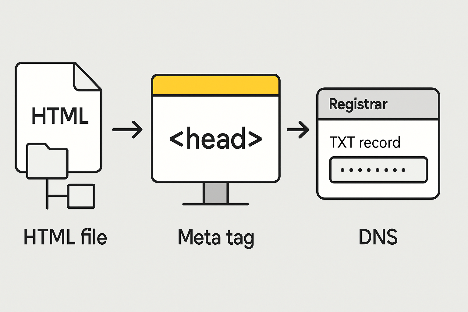 - Как подтвердить? — HTML‑файл / мета‑тег / DNS (TXT‑запись).